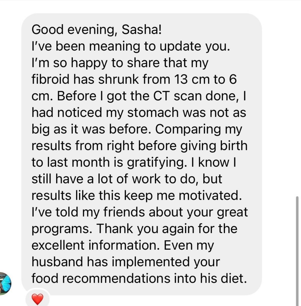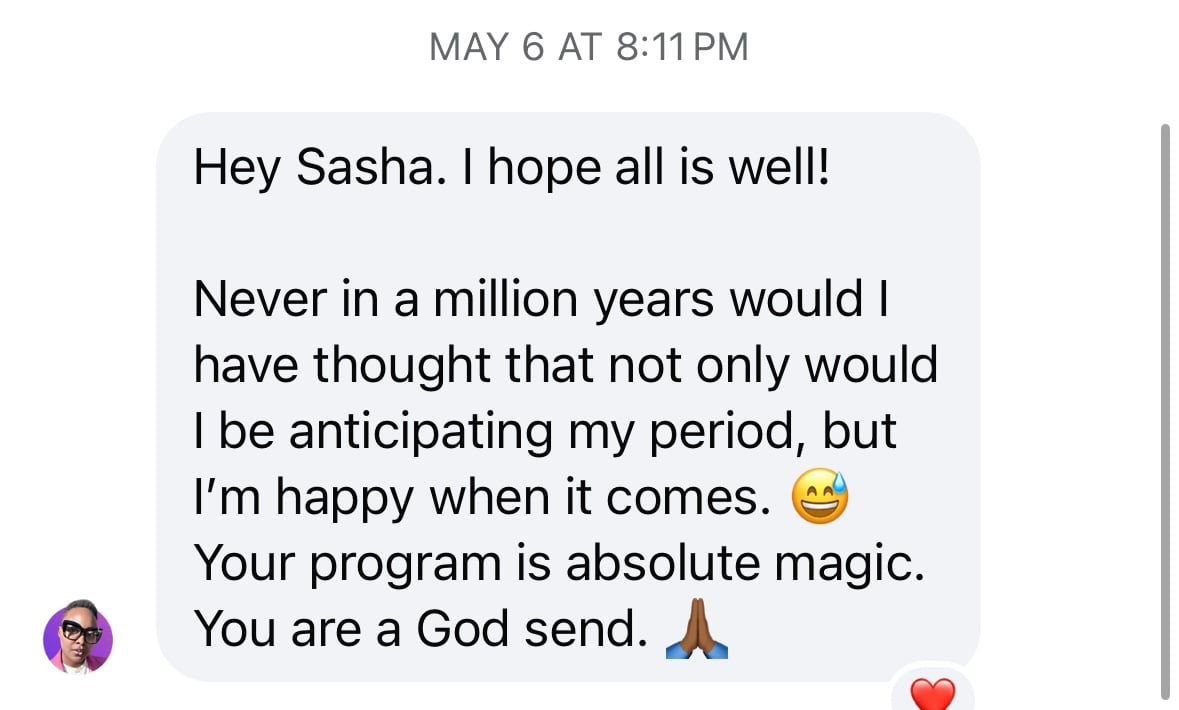 Thank you so much Sasha! I tell everyone about your program. I am signing up to coach with her for the rest of the year so she can help me of the rest of my fibroids!