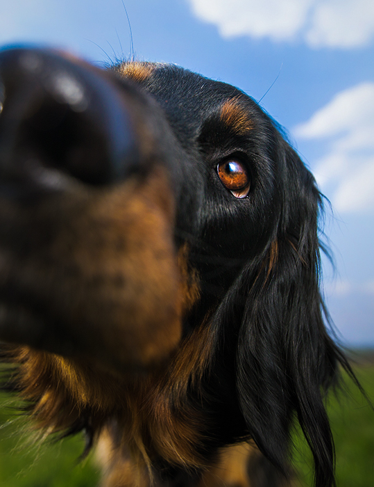 ☉ Sesja Nose in the Lens to sesja wykonana w większości przy użyciu obiektywu szerokokątnego - wielkie nosy, oczka czy łapy na pierwszym planie to coś co wszyscy kochają! W tej sesji pies pozuje wyjątkowo blisko fotografa - i właśnie z nosem w obiektywie.