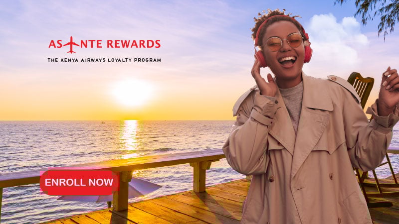 Asante Rewards is the Kenya Airways loyalty program that gives you access to what you love. Enroll and enjoy 10% off your flight with 1,000 Bonus Points, 10% off on extra 1st checked luggage, 10% off at KQ lounges and 10% off on Standard Seat selection.