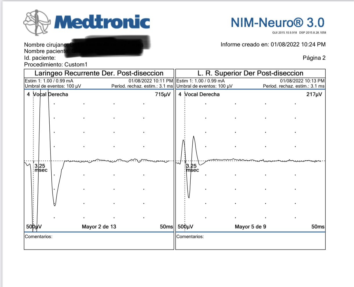 Existe la posibilidad de situaciones algo peculiares en las que los registros pueden mostrar alteraciones, pero la voz del paciente se mantiene normal después de la cirugía. Por esta razón, se recomienda un procedimiento llamado laringoscopia después de la cirugía bajo neuromonitoreo, con el fin de descartar cualquier trastorno en las cuerdas vocales y confirmar la integridad de estas estructuras. Esto proporciona una mayor seguridad y garantiza que no haya parálisis o debilidad (paresia) en ninguna de las cuerdas vocales.