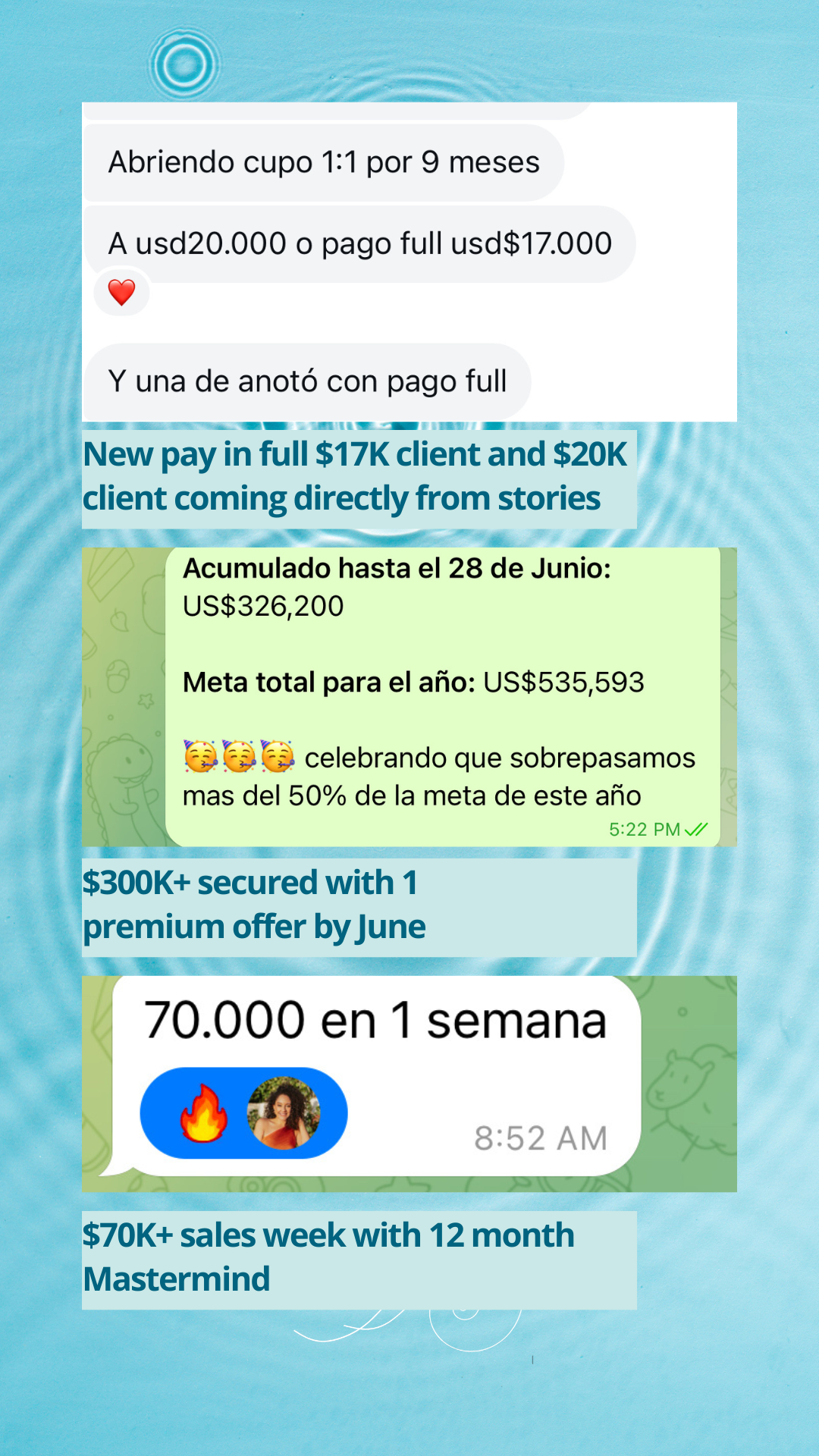 I started charging $1,800 for 3 months of coaching in 2021, and now I attract exceptional clients who are excited to invest $15,000 and $36,000+ in my premium offers. I support clients all around the world and have successfully grown my business to multiple six figures in both English and Spanish.